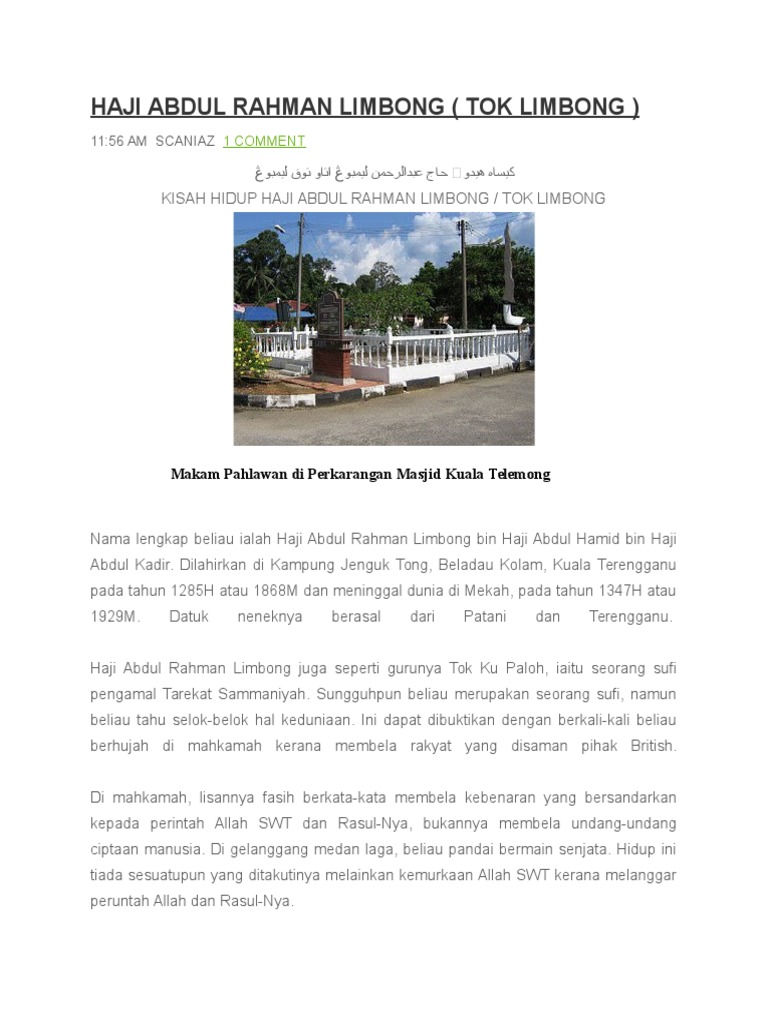 Sop solat berjemaah di surau 1. Bunun yerine, terengganu'dan sürgüne gönderildi. • haji abdul rahman limbong menegaskan tanah adalah hak allah dan rakyat bebas mengerjakannya tanpa membayar cukai kepada kerajaan. Tuan haji abdul rahman limbong atau nama sebenarnya haji abdul rahman bin abdul hamid merupakan tokoh agama yang berpengaruh luas di dan ternyata, dalam sejarah perjuangan bangsa melayu, haji abdul rahman limbong telah berjaya membangkit semangat pergerakan menentang. Haji abdul rahman bin haji abdul hamid.